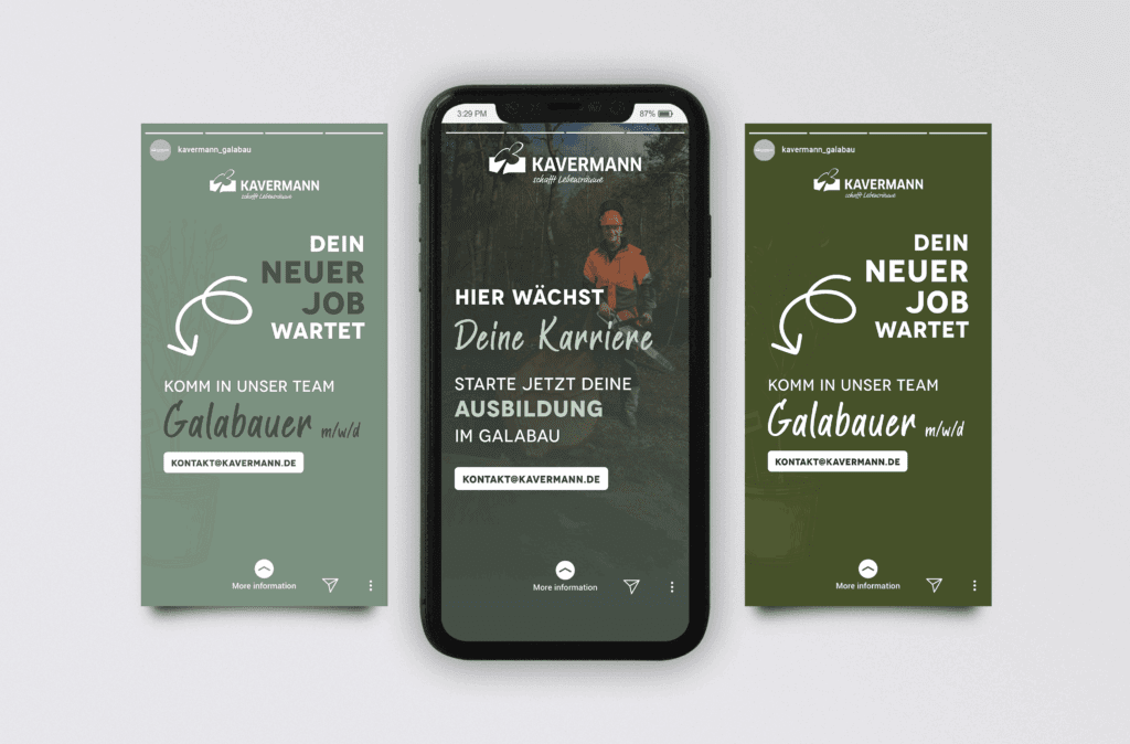Für die Firma Kavermann haben wir statische Story Ads entwickelt, die gezielt auf Instagram und Facebook ausgespielt werden – dort, wo potenzielle Bewerber:innen täglich unterwegs sind. Der große Vorteil: Story Ads erscheinen im Vollbild, wirken direkt und lassen sich ideal für klare, schnelle Botschaften nutzen. So erreichen wir maximale Aufmerksamkeit in Sekunden – und lenken Interessierte mit einem Swipe direkt zur Bewerbung.